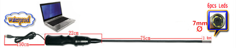 本款标配1.5米USB线,手柄至管0.22米,管长0.75米,前端镜头摄像头直径:7.0mm,6颗光度可调节LED 灯,防水设计操作简单,方便易携,设计符合人体力学原理,让您轻轻松松做检测!