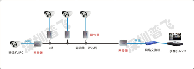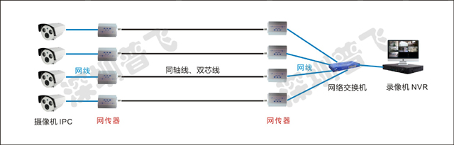 正好应用在原有老系统中,原有视频线或是双绞线可以保留使用,省去重新布线、挖沟的工作,省时省人力,直接在视频线的头尾各安装一个网传器,然后把之前的模拟摄像机换成新的IPC网络摄像机,把后端的DVR换成新的NVR录像机,多加一台网络交换机,就完成了系统改造升级的工作了。