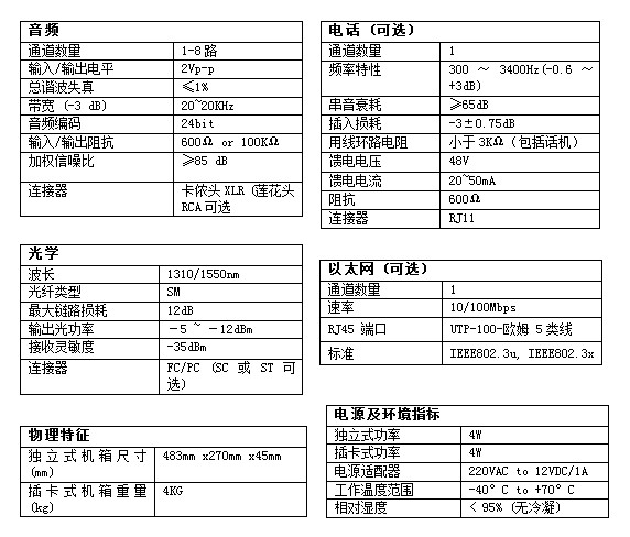 • 在单芯光纤上传输多路广播级模拟体声音频(多路单双向可选, 立体声可选)