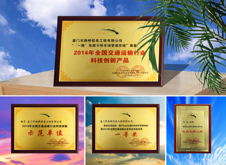 会上,路桥信息公司被授予“2014年全国交通运输行业科技创新示范单位”的称号,公司旗下“一路免取卡停车场管理系统”、“基于SaaS云模式的养护管理系统”两项产品分别荣获年度全国交通运输行业科技创新产品奖、科技创新成果一等奖,公司总经理于征当选为年度全国交通行业科技创新人物,可谓满载而归。