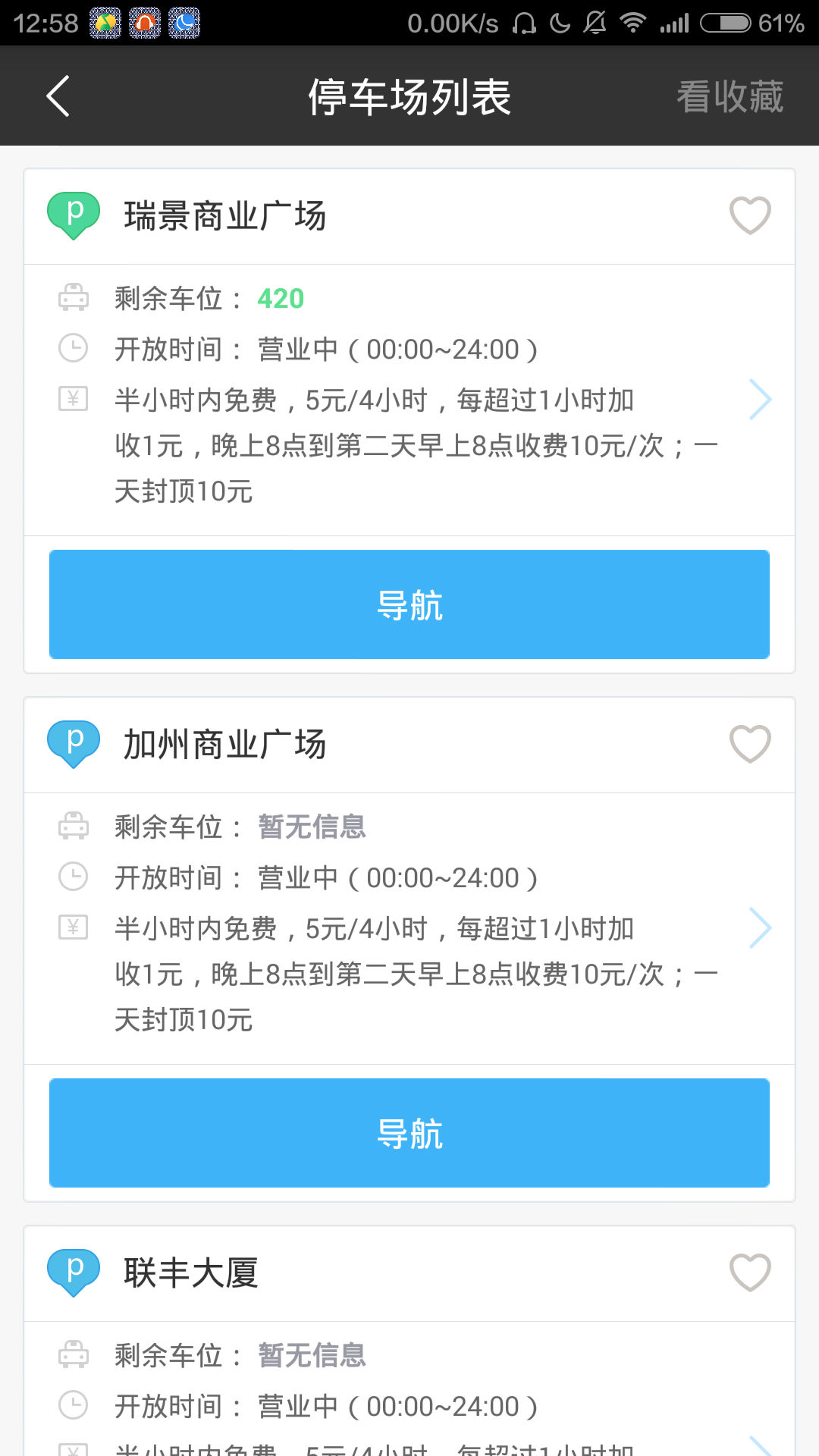 据悉,首期已接入停车信息共享平台的停车场有近百个。车主下载安装“i停车”APP后,点击“找车位”,手机App根据车主当前所处的位置显示附近所有停车场,部分停车场可显示实时剩余车位,进入“停车场列表”还可进一步查询附近停车场的开放时间和收费标准详情。