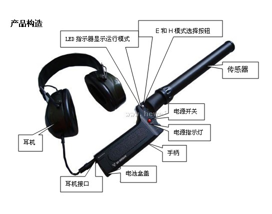 此产品包括电子机械探测装置(H)、电子时钟探测装置(E)、气传导接触式耳机,低噪音扩音器、过滤器和微型处理机。电子机械探测装置(H)、电子时钟探测装置(E)分别置于主机内部。此产品根据探测物体的信号强度不同分别设计了电子机械式装置(H档):15-40cm 及电子式时钟装置(E档):1-5cm ,使用者可通过耳机来监听其探测结果。