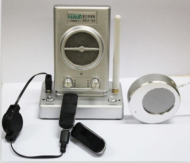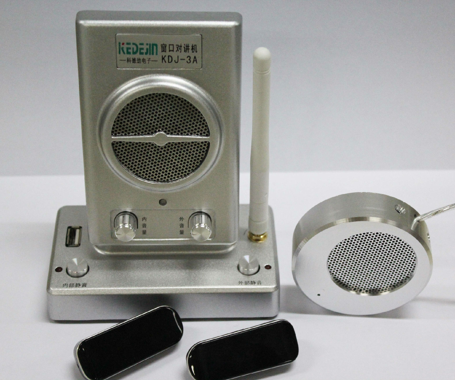 2.4G无线KDJ-13AW窗口对讲机集成有线KDJ-13AW窗口对讲机的特点,双通道自动控制,自动转换,有效防止自激啸叫和通道窜扰;专业的箱体结构设计,采用硬质金属腔体完全杜绝了机身共振,使音效达到纯美自然、通透明亮;考究的银色金属外壳,竞显尊贵大方,且永不老化 ;独特的内外静音功能,让你享受充分的自由空间。更为显著的是她独特的功能,无线蓝牙输入口,利用无线2.4G传输技术,实现无限制360度自由转变窗口对讲。