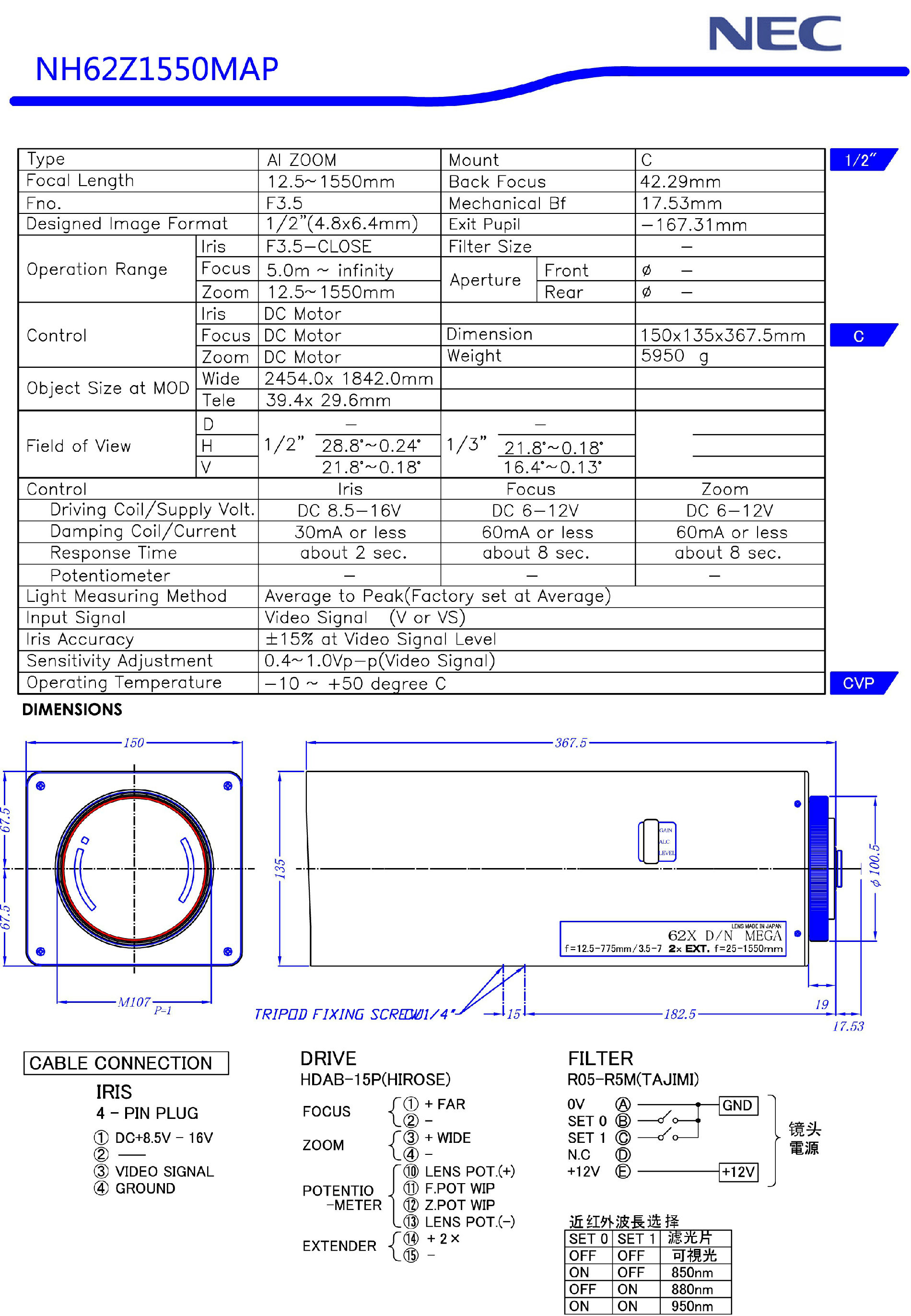 光圈 | 三可变DC光圈(VIDEO驱动或遥控) | |||