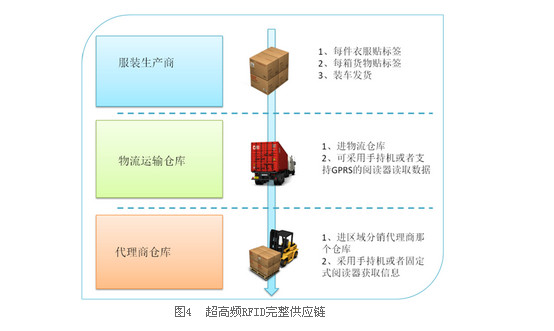 通过超高频RFID服装供应链管理在单品服装、包装箱、托盘和货位都加贴超高频RFID电子标签,实现所有管理单元的可视化管理,可以大大缩短包装、搬运、盘点、统计时间,从而减少货损,加速资金周转,大幅提高仓储管理效率,并能实时掌握产品入库、出库情况,实现盘点作业的自动化,减少人工作业,解决人工作业易出现人为差错和信息交流不及时的传统管理模式痼疾,自动进行货龄分析,自动产生缺货和滞销品报警,实现超高频RFID服装供应链管理。