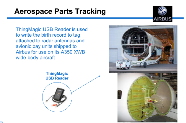 空中客车公司(Airbus)估计,每架飞机上大约有3,500个零部件可以使用RFID来跟踪 - 相当于接近9200万的标签要求,当然这只是不完全统计。工程师不是故意装配不合适的零件,也不是故意使用质量差的零部件,只是零部件的使用性能很难在使用前简单判断。而且由于空中客车公司(Airbus)需要对飞机的安全负责,所以不能承担任何风险。