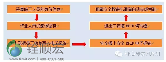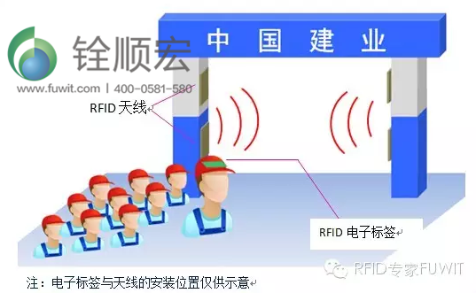 在进出建筑工地的大门安装RFID识别设备,当戴有安全帽的工人通过时,通过对安全帽上绑定的电子标签的识别,从而实现对考勤人员身份的识别。