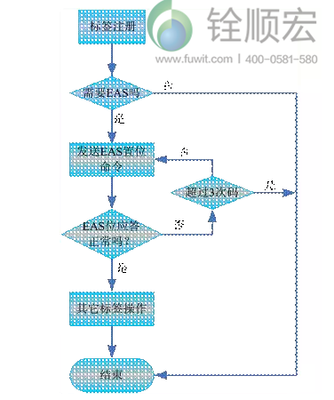 电子标签在使用前,需要先注册,注册就是将电子标签内写入要附着的物品的基本信息,并将信息录入数据库的过程。每一个电子标签内有一个特殊的读写EAS位,只有通过特定的命令才可以修改。在标签的注册过程中,同时将该EAS位置位。EAS位的置位流程可参考图1。