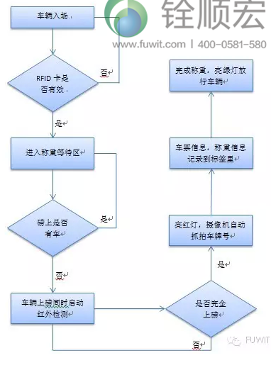 车辆入场,验证RFID卡是否有效,然后进入称重等待区,验证磅上是否有车,在车辆上地磅的同时开启红外检测器,如果完全上磅,亮红灯,摄像机自动抓拍车牌号,然后将车牌的信息、称重信息记录到标签里,传到计算机控制中心,完成自动称重过程。