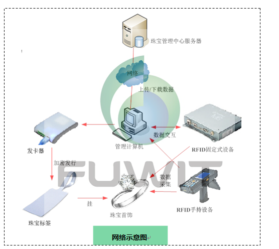 本系统深入渗透于珠宝资产从入库、在销售、盘点、售出等各个关键节点,结合计算机和网络技术,实现珠宝资产的信息化、精确化和高效性管理。其基本网络示意图如下: