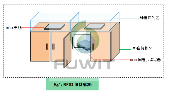 每一个展示柜台的下面,将隐蔽性的安装RFID设备,包括RFID天线和RFID固定式读写器,天线的数量根据珠宝陈列区的大小选择,最多支持四个天线,可实现珠宝陈列区的全范围无死角读取。商品上架流程启动后,读写器开始工作,将各柜台商品信息扫描并上传到计算机,工作人员可核对该信息,如无误即可“完成上架”,此后,读写器开始进入珠宝安全监测状态。工作人员可根据销售工作的实际情况,通过软件灵活配置允许预警时间,在预警时间内,系统监测不到珠宝标签但并不会告警,一旦超过预警时间,系统将会启动报警设备。