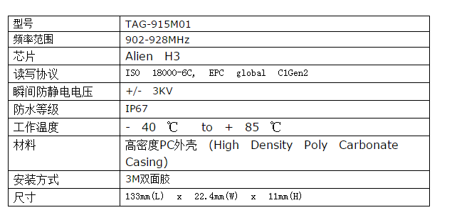 TAG-915M01专门为金属等复杂环境设计的一款标签。具有阅读距离远,灵敏度高,物理特性优良的特点。可方便地应用于金属资产设备管理、车辆管理、物流等场合。