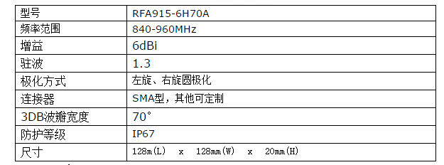 RFA915-6H70A是一款适用于UHF频段RFID应用场合的通用型天线,具有高增益、低驻波等特点。外形美观小巧、采用防水圈与硅胶双重防水设计、外壳采用加强筋位设计、适合各种恶劣环境使用。可方便地应用车辆、仓储、物流、零售等UHF频段的RFID场合中。