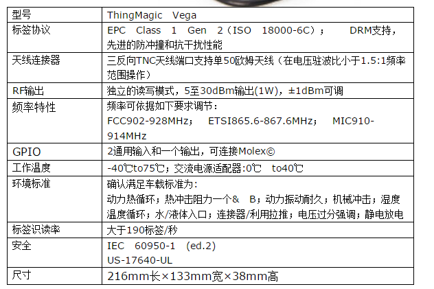 ThingMagic-Vega是一款车规级RFID读写器,它通过了汽车行业标准:TS16949,内嵌高性能M5eUHFRFID模块,满足于恶劣环境作业标准要求,非常适合部署于叉车和各类汽车应用上。