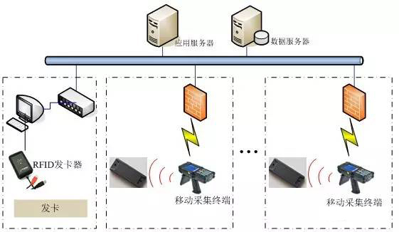 系统主要有RFID发卡器、RFID固定式读写器、RFID手持机、应用服务器和数据服务器等构成。在航空维修工具管理系统中,RFID发卡器完成电子标签的初始化,固定式读写器来实现工具的批量出入库管理,在盘点的时候可以采用手持机管理。