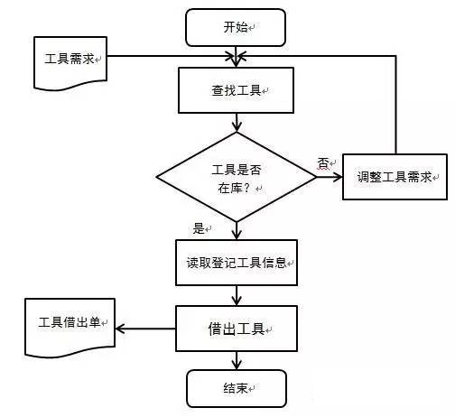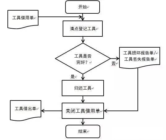 工具归还主要负责登记归还工具时的工具信息与借用单上的信息相对应,如果有工具损坏再填写工具损坏报告单转入工具存储管理流程。