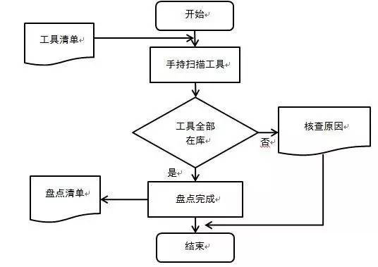 工具盘点主要是由仓管人员定期对库存工具进行清点盘存的作业。仓管人员将系统中的库存工具清单下载到RFID手持机中,持手持设备,到相应的库房对工具进行清点。