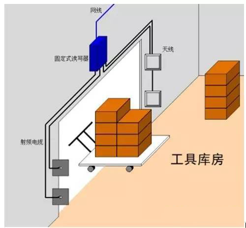 固定式的读写器安装在工具库门的两侧,构成扫描通道,当贴有标签的工具通过大门时,读写器读取工具的电子标签相关信息,把数据上传给后台中心数据库,中心数据库对相关的信息进行处理,进行记录,从而实现对航材的管理。