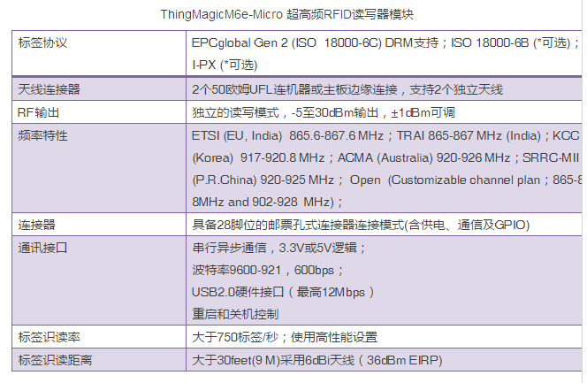 ThingMagicM6e-Micro,一款采用超小型模组结构设计和优异的“快速搜索算法”的超高频RFID模具,可以嵌入到各种常用的手持和便携式设备中。它对标签的读取速度高达750标签/秒,功耗低,接收指令后反应快速。同时,其拥有超群的多标签防碰撞算法,特别适用于仓库盘点;其特有的-5dbm到+30dbm的可调功率,可方便的应用在工具的精确定位上,对快速的查找指定工具提供了保证。