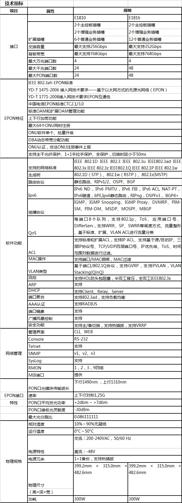 NTW-E1800 OLT遵循IEEE802.3ah,《YD/T 1475-2006接入网技术要求——基于以太网方式的无源光网络(EPON)》和《中国电信EPON 设备技术要求》中对于GEPON OLT设备的相关要求。