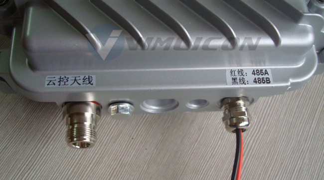 VM-1503SY发射端有6个接口,分别标示为:视频输入、音频输入、云控天线、视频天线、485输出、电源线;在安装时请严格按照标示连接对应的接口;视频天线接口连接1.2G螺旋天线,云控接口连接全向天线,485连接线与云台解码器485A/485B对应连接。