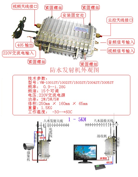 1、VM508AS 发射5W,在无线传输距离2~5公里时使用或者在视频接收机VM104RS内内置一个