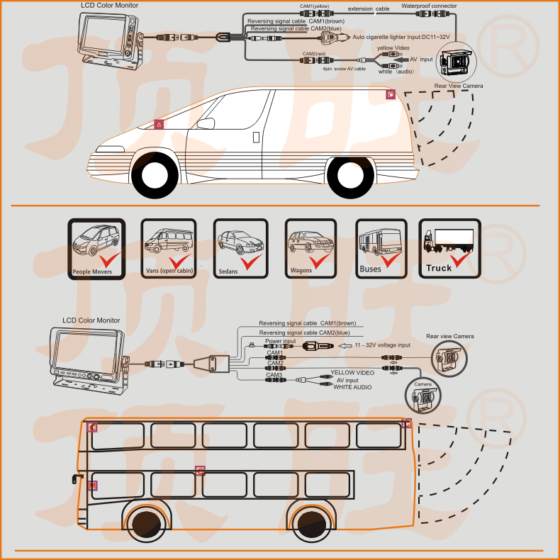 支持两路摄像机视频输入,宽电压范围DC11-32V输入;