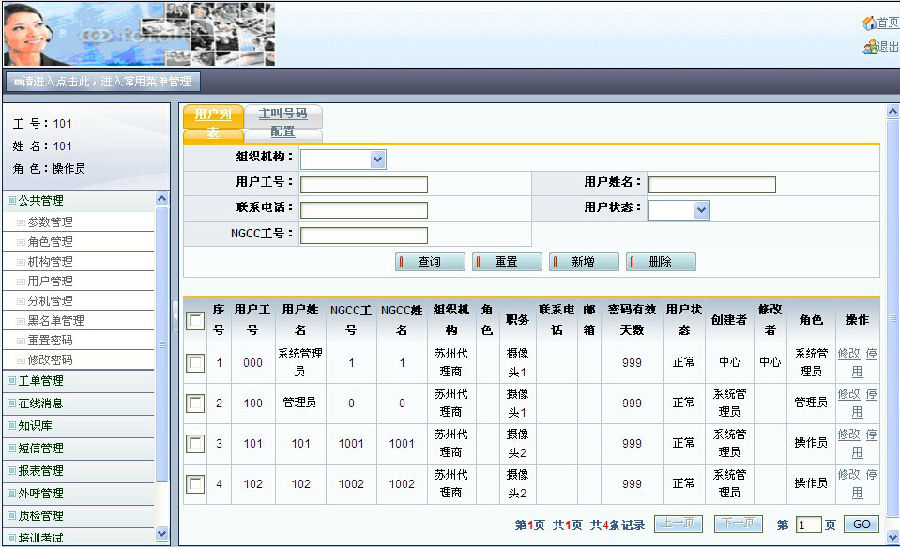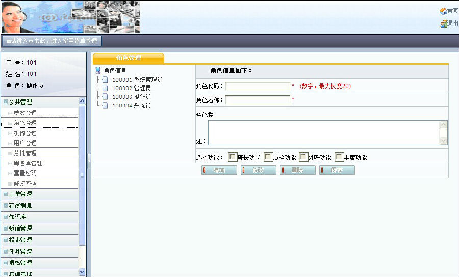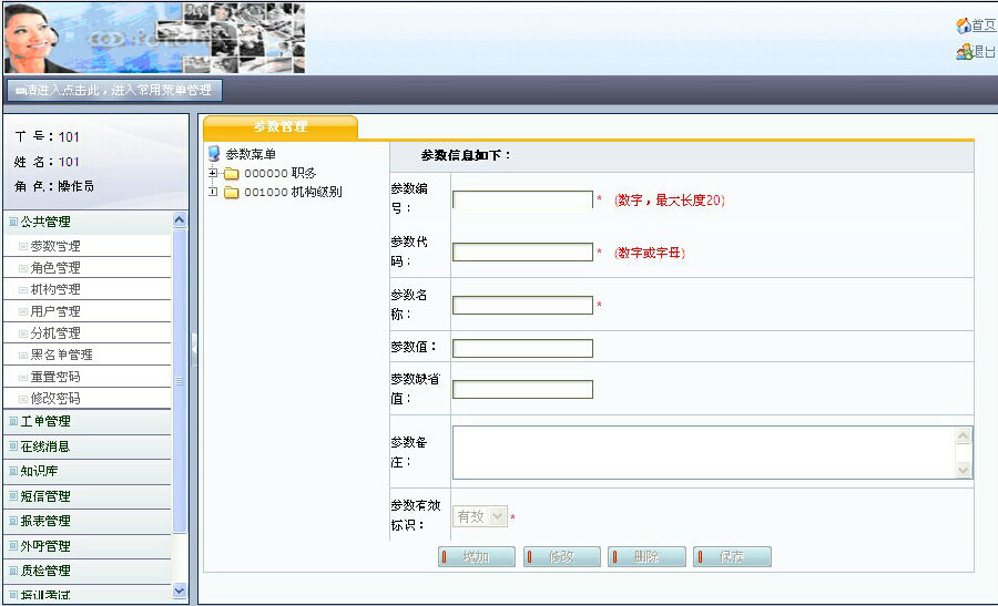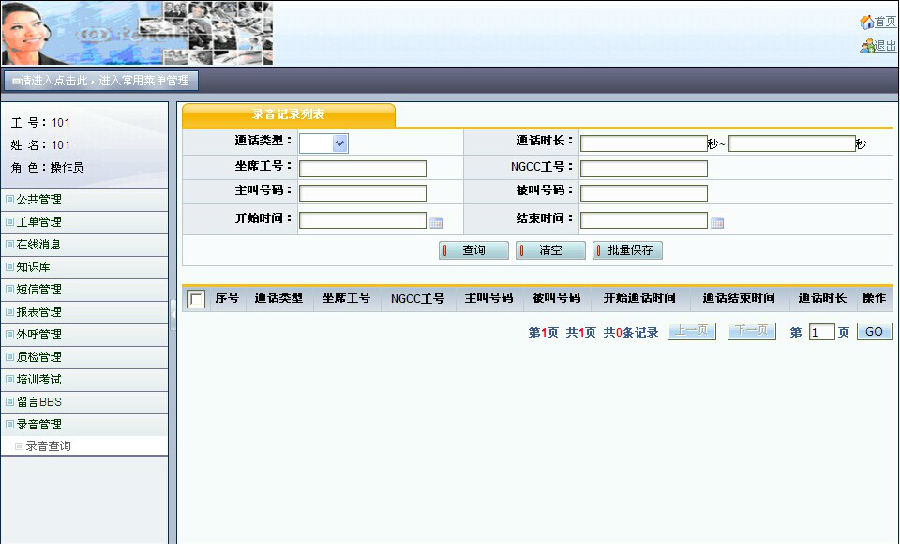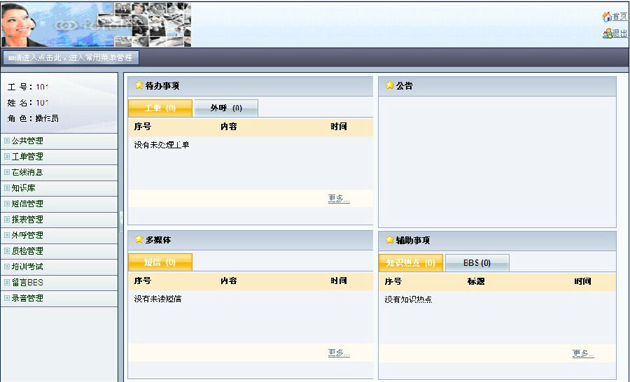 | 呼叫中心业务系统 1.公共管理 2.工单管理 3.在线消息 4.知识库 5.短信管理 6.报表管理 7.外呼管理 8.质检管理 9.培训管理 10.留言BBS 11.录音管理 |