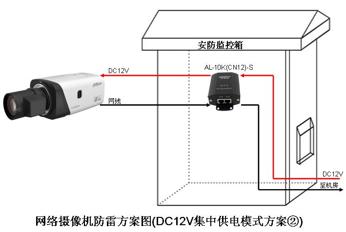 1.如以上方案图中的(DC12V集中供电模式②)属于集中供电DC12V,所以需要选择“电源DC12V+网络端口”的防雷器。如AL-20K(CN12)-S