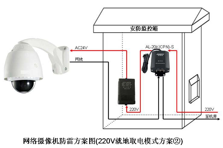 2.方案图中的(AC220V就地取电模式方案②)则属于就地取电AC220V,所以需要选择“电源AC220V+网络端口”的防雷器。如AL-20K(CPN)-S