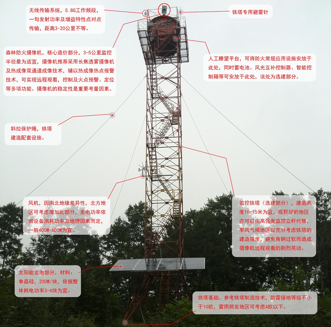 | 3.1 | 安装支架 | 订购 | 塔台中央位置突出一个1.2米支架平台,用于安装林火识别监控预警摄像机;铁塔防雷接地系统采用整体接地方式,塔顶建设专用避雷针 | 套 | 1 |