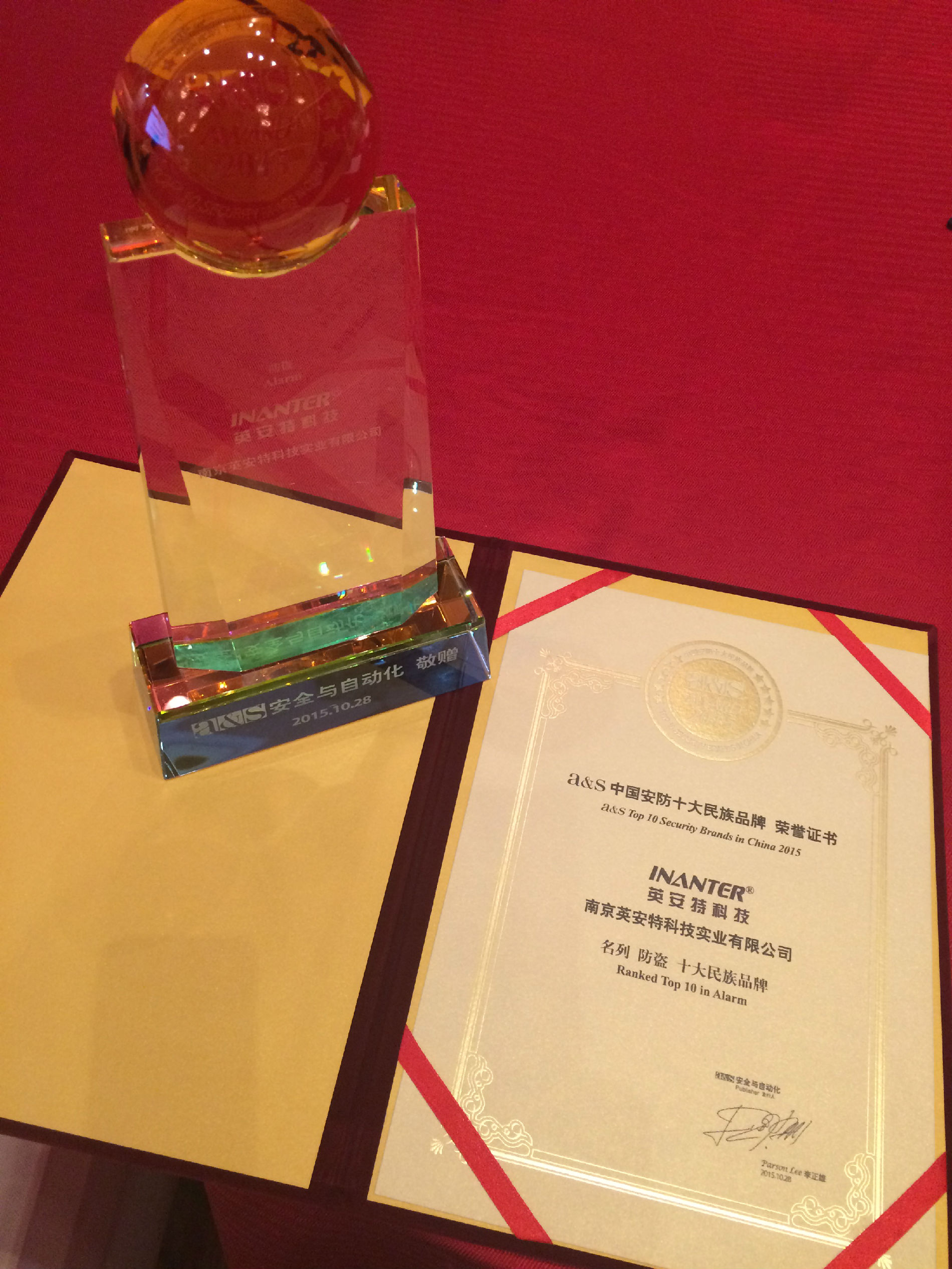 2015年10月28日,由中国安防权威杂志a&s《安全&自动化》主办的2015年度“a&s中国安防十大品牌”颁奖典礼在深圳马可波孛酒店举行,英安特凭借优良的市场口碑和优质的产品性能,再获“2015a&s中国安防十大民族品牌”称号。