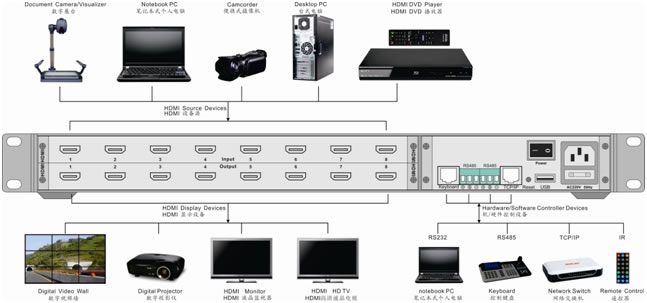 ◆·支持多路HDMI视频输入,多路HDMI输出与及嵌入式多通道数字音频信号的交叉切换;