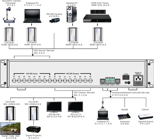 SD/HD/3G-SDI数字矩阵切换主机是专为数字视频信号的显示切换而设计的高性能智能矩阵开关设备,用于将多路SDI数字视频输入信号切换到输出通道中的任一通道上,一路输入可对应多路输出,一路输出只能对应一路输入。
