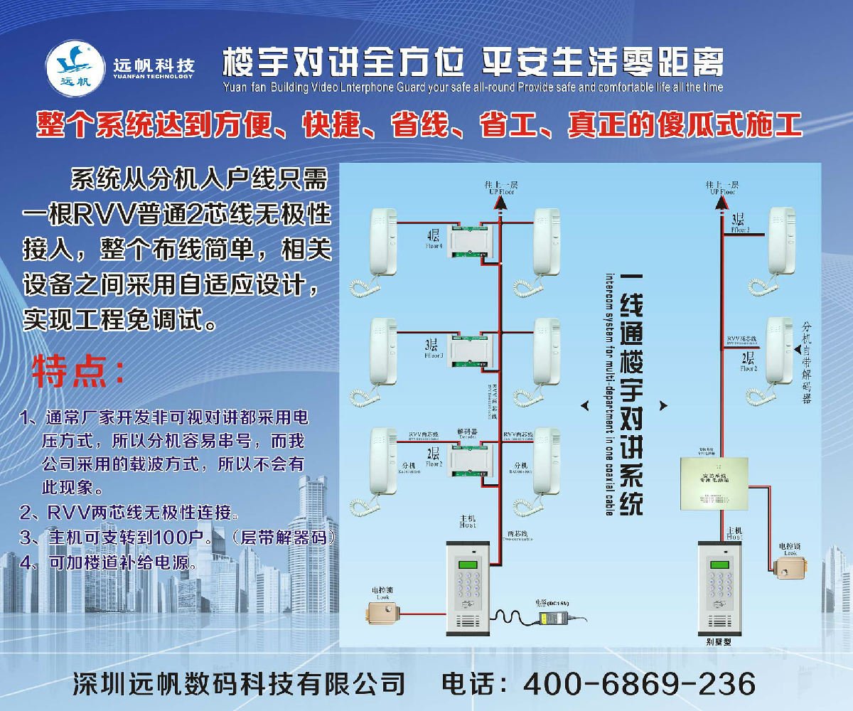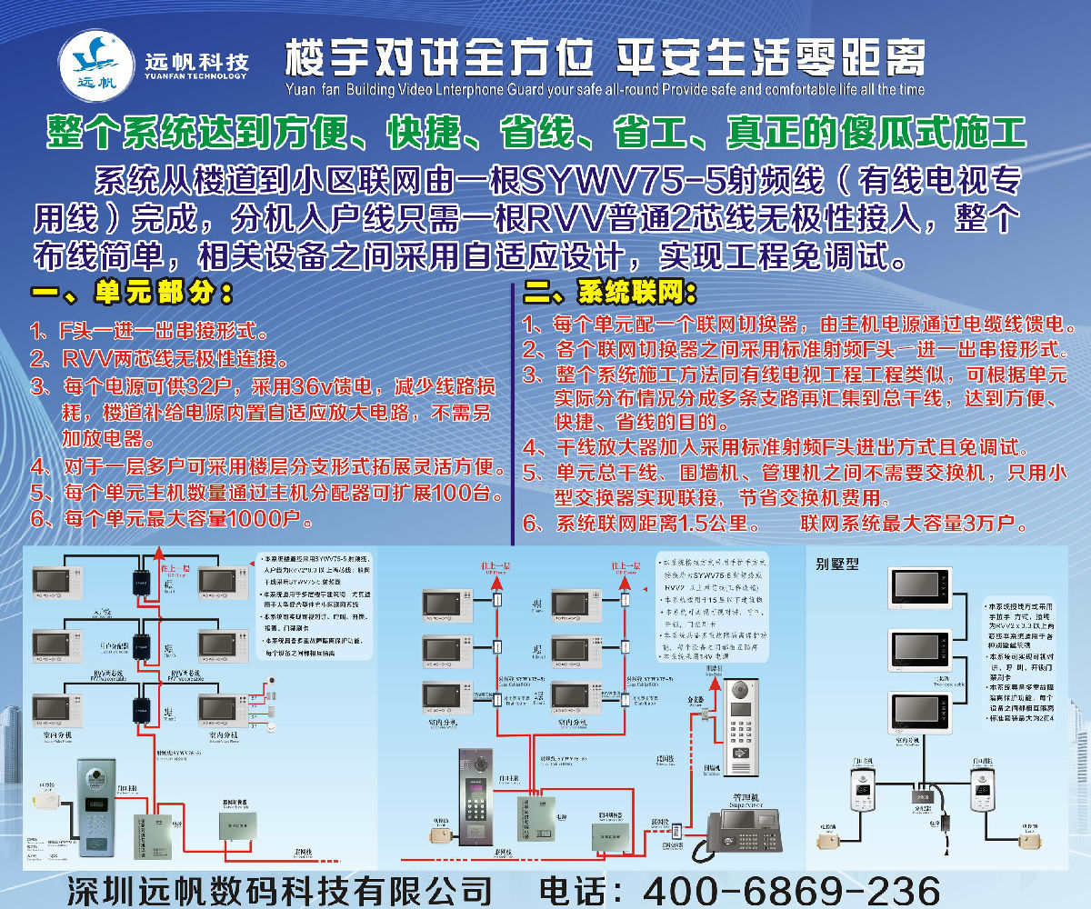 (1)由于单元主机与住户分机以及单元主机与中心交换机之间只用单根射频线连接,无论是楼栋内网络还是联网部分都会节约大量线材。
