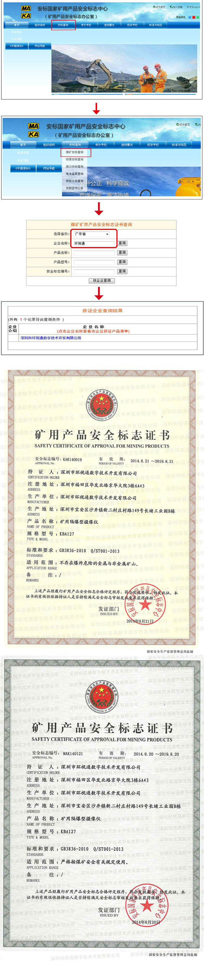 另,“夜视鹰”是环视通公司其中的一个品牌,所有证书需以企业名称申请,所以查询结果和煤安证上不会有“夜视鹰品牌”字眼出现,请悉知!
