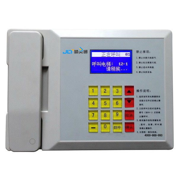 3、可以单独接收每部电梯呼叫(主机显示:100号楼1号电梯来电,1区2号楼三单元1号电梯来电,市场唯一领先)。
