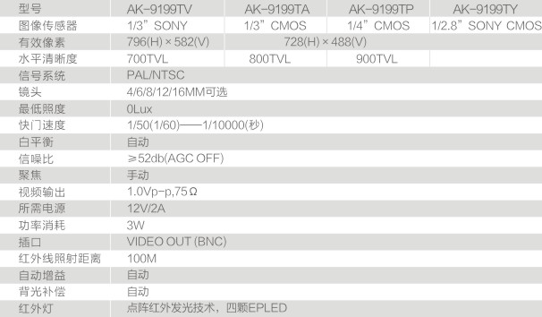 水平分辨率为700TVL/800TVL/900TVL/1200TVL采用高度集成的DSP处理芯片、极低功耗、超强的稳定性单晶点阵式光源,让夜视更清晰自动增益,自动白平衡色彩自动调节、色彩还原真实强大的数字降噪功能,信噪比大于52dB卓越的背光补偿功能,使该摄像机在不同的光照环境下都能提供高清晰、色彩还原真实的图像移动侦测、隐私遮蔽功能日夜型:摄像机自动彩色黑白转换采用新红外技术,夜晚也能捕捉到清晰的画面部分方案支持OSD菜单控制,可以通过人性化的菜单对摄像机进行参数设置