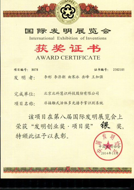 本届发明专利展会由科学技术部、国家知识产权局、中华全国总工会、中国科协、共青团中央等单位支持协办,展会面积超过2万平方米,展位1000多个。来自美国、德国、韩国等30多个国家和地区,以及国内各省市发明协会和解放军等代表团的1000多个机构和发明人参展,近3000个最新技术发明亮相。我公司专利成果在众多国内外参展参评发明中脱颖而出获得银奖,一方面使“非接触式活体多光谱手掌识别系统”在国内和国际专业领域获得肯定,另一方面更为公司推广此成果转化下的“非接触式掌纹掌脉识别产品”增添助力。