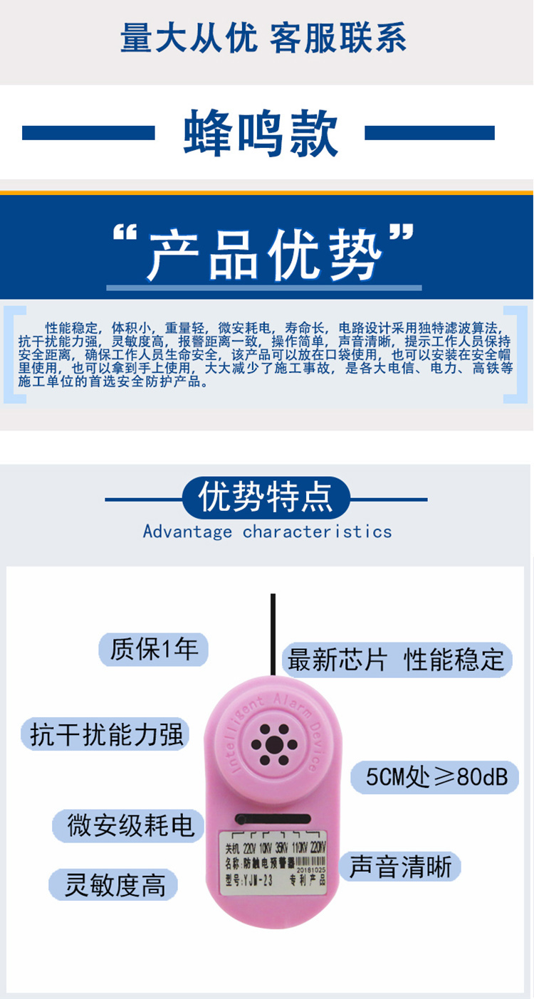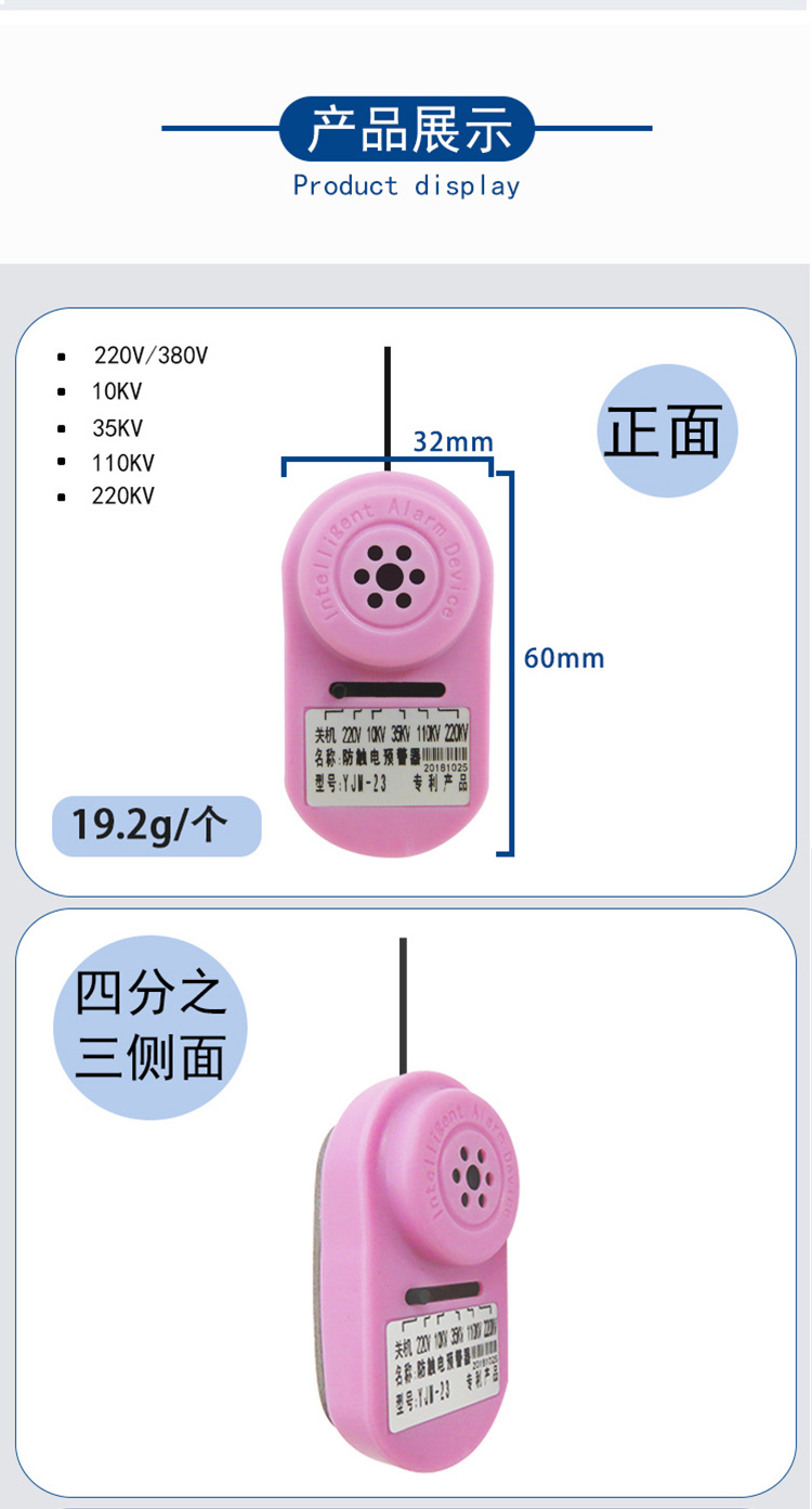 YJM-23时安达®防触电预警器适用于电力行业220V-220KV工作环境,五个电压报警档位可选,采用蜂鸣器报警方式,优点:价格低、体积小、重量轻、耗电量小、使用寿命长、操作简单方便、报警清晰,是电工特种作业人员的一种极为有效低成本的安全辅助用品。