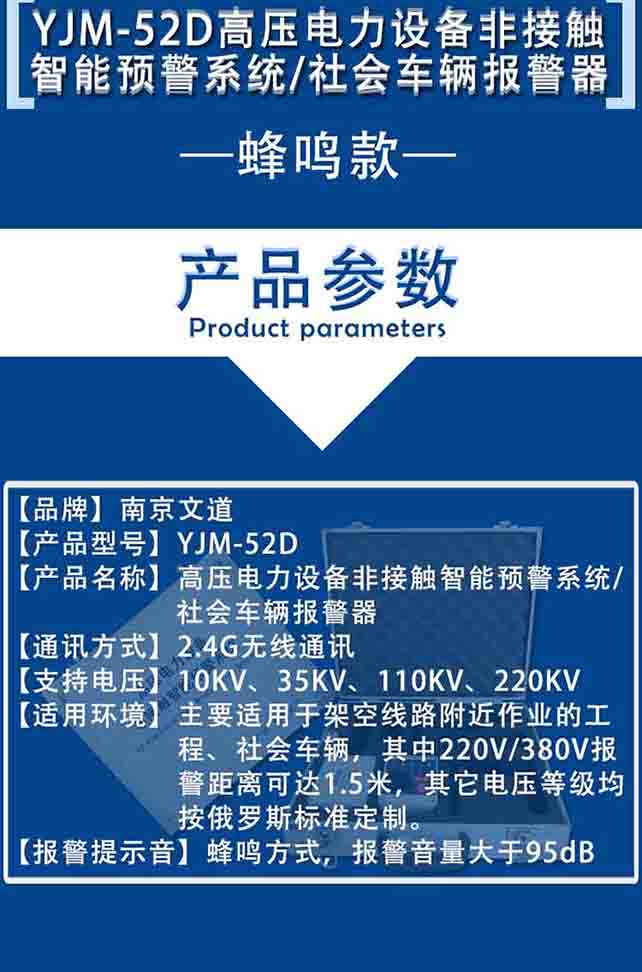YJM-52/53高压电力设备非接触智能预警系统应用安装在大型机械上,用于作业车辆在高压线路附近作业时的安全防护,本产品适用于10KV-220KV高压线路附近工作的作业车辆,有多级灵敏度可选。