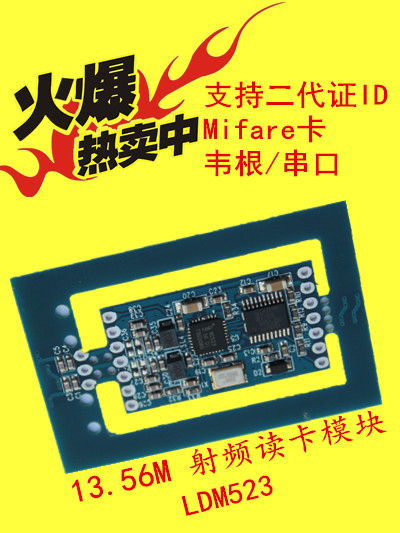 LDM523射频模块是一款天线一体化,同时可以读M1卡,二代证序列号,TX523T采用13.56MHZ射频基站。当有卡靠近时,模块会以韦根或者是UART的方式输入卡号,用户仅需简单的读取即可。该读卡模块完全只读二代证序列号,读写MIFARE系列卡及其兼容IC卡片的操作,非常适合门禁,考勤等身份识别系统的应用。
