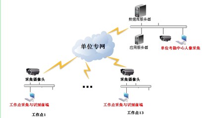 2、前端单位考勤点,单位员工通道出入口等地点各设置网络面部考勤设备;