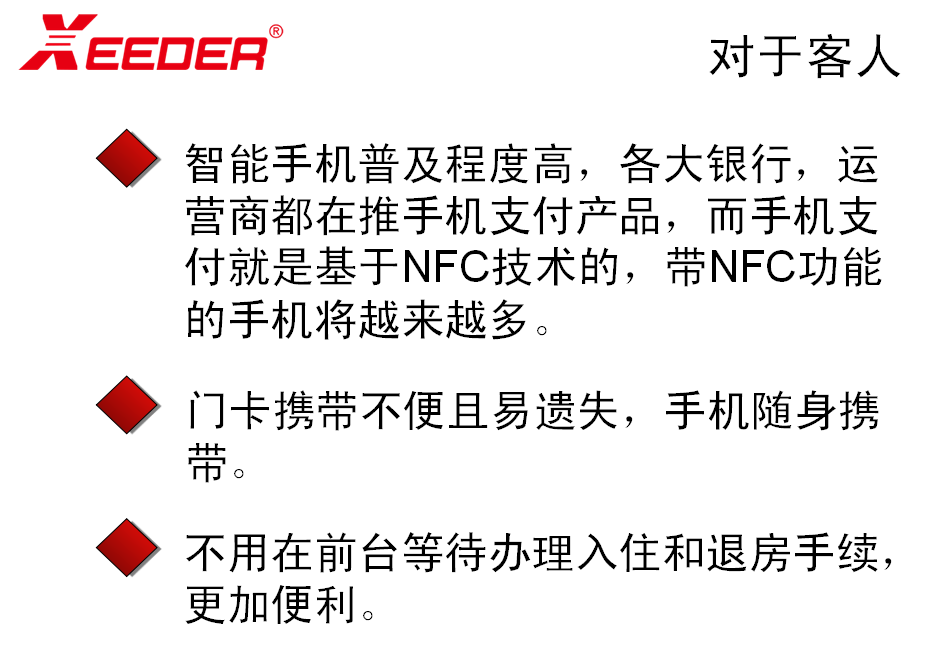 手机门锁:酒店微信或APP链接实现手机登记、入住、支付、开门和取电.