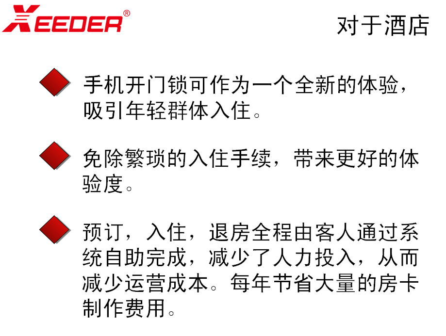 预订,入住,开门、取电、退房全程由客人通过手机系统自助完成,减少了人力投入,每年节省大量的房卡制作费用,因此每年可以减少大量的运营成本。