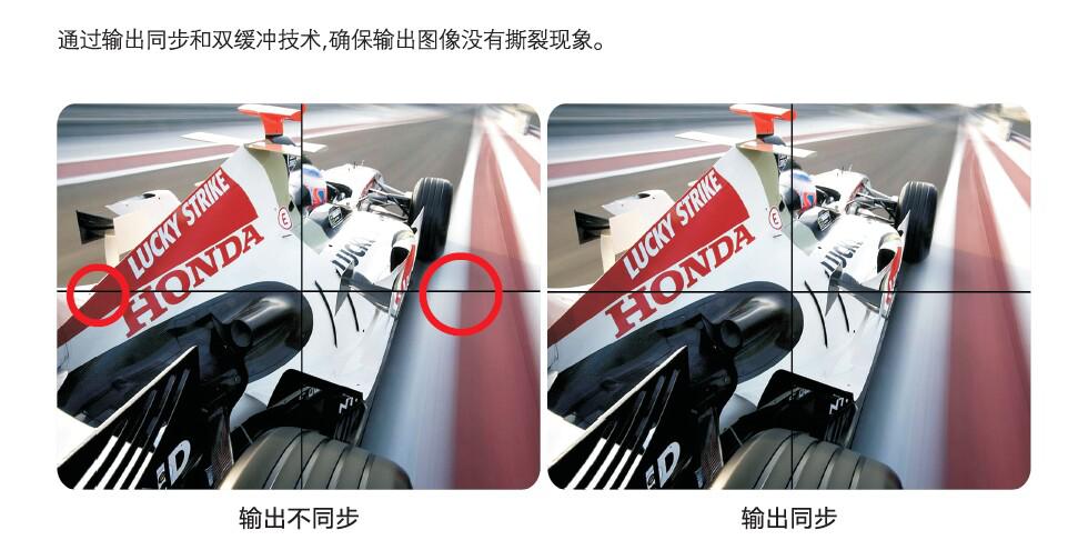 厦门西联为4K显示专门研发的多屏幕拼接处理器,是一款纯4K拼接器,除了具备纯硬件高清拼接器的卓越性能之外,西联4K接器在4K视频信号的处理上有着更加突出的优势。它解决了4K视频画面出现拖尾、撕裂、甚至刷新率降低的常见问题,从而真正展现了4K视频画面的魅力。传统拼接器是用双链路单口采集4K信号,由于带宽限制,单口双链路不能真正满足纯4K信号的采集,视频画面会出现刷新率大大降低、拖尾、撕裂的情况,西联拼接器是用四个输入口同时采集一台电脑(带有四口输出的显卡)4K信号,而如下图画面对比:左边是4K信号通过传统拼器上墙,右边是4K信号通过西联拼接器上墙: