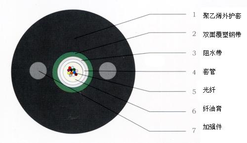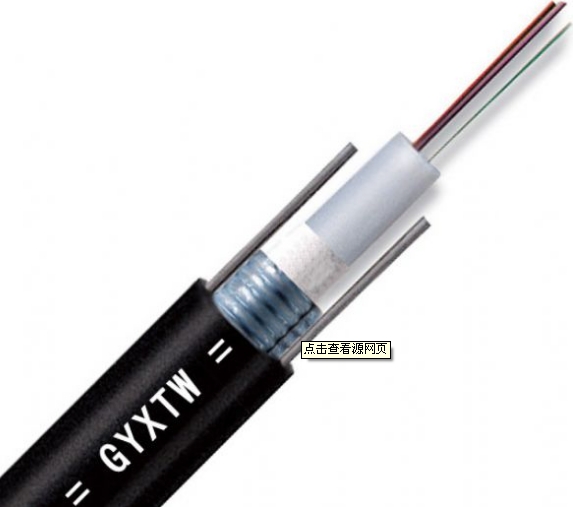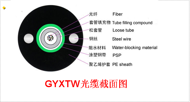 GYXTW 光纜的結構是將 250μm 光纖套入高模量材料制成的松套管中,松套管內填充防水化合物。松套管外用壹層雙面塗塑鋼帶(PSP)縱包,鋼帶和松套管之間加阻水材料以保證光纜的緊湊和縱向阻水,兩側放置兩根平行鋼絲後擠制聚乙烯護套成纜。
