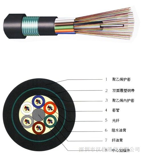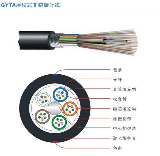 產品描述 GYTA 光纜的結構是將 250μm 光纖套入高模量材制成的松套管中,松套管內填充防水化合物。纜芯的中心是壹根金屬加強芯,對於某些芯數的光纜來說,金屬加強芯外還需擠上壹層聚乙烯 (PE)。松套管(和填充繩)圍繞中心加強芯絞合成緊湊和圓形的纜芯,纜芯內的縫隙充以阻水填充物。塗塑鋁帶(PL)縱包後擠制聚乙烯護套成纜。 |
