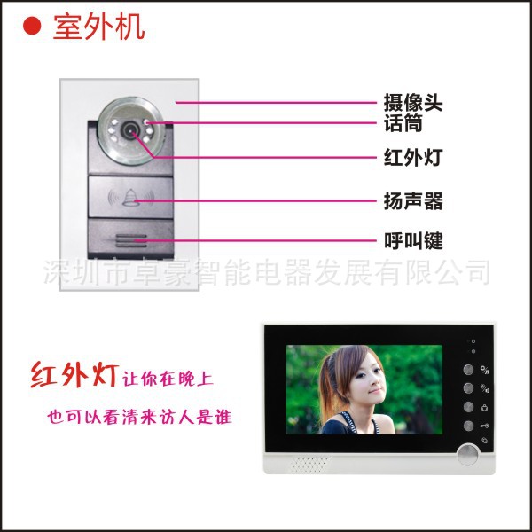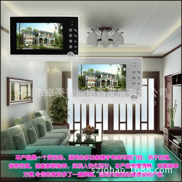本产品是一个灵活的、适用的多功能楼宇有线可视门铃,抗干扰强,保密性高,造型新颖独特,实现人性化设计,本产品图像清晰,安装简单方便,令您的家居多了一道屏障,是现代家居的理想安防产品.