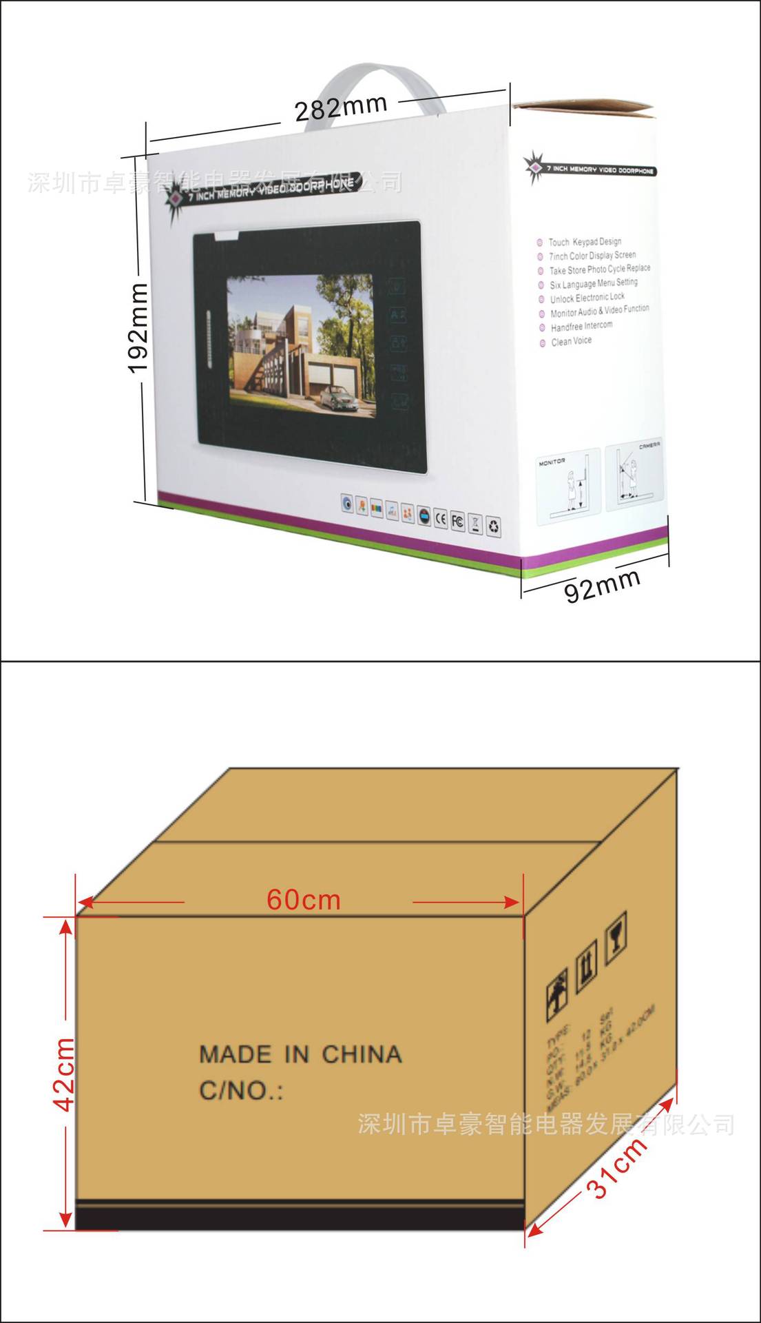 产品实现室外摄像、室内显示、双向对讲的功能,室内可控制电